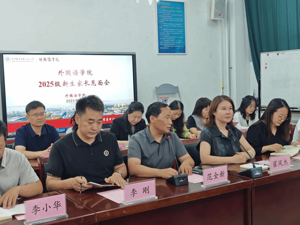 范全新致欢迎辞,对各位家长的到来表示热烈欢迎,他着重强调了家校联动在人才培养中的重要作用,希望借家长会搭建起家校沟通的桥梁,教师与家长合力,为学生们的成长保驾护航。翟风杰对学院的整体状况、师资队伍以及鲜明的办学特色进行了全面系统的介绍,进一步阐述了学院未来的发展规划与战略布局,特别是对学生专业素养的养成和学院“语言+”人才培养创新进行了重点介绍。