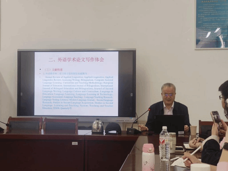 周长银教授以科研的学术价值、个人价值和社会价值为导入,从功夫在诗外——论文写作前的理论准备入手,讲解了论文选题的原则,列举了近20年来国内外语教学的热点课题,并从方向选取、热点跟踪、文献检索、选题定题、文献综述、论证写作、修改等环节分享了外语学术论文写作的体会和经验。周教授深厚的学术功底和丰富的科研经验使参会师生们受益匪浅。