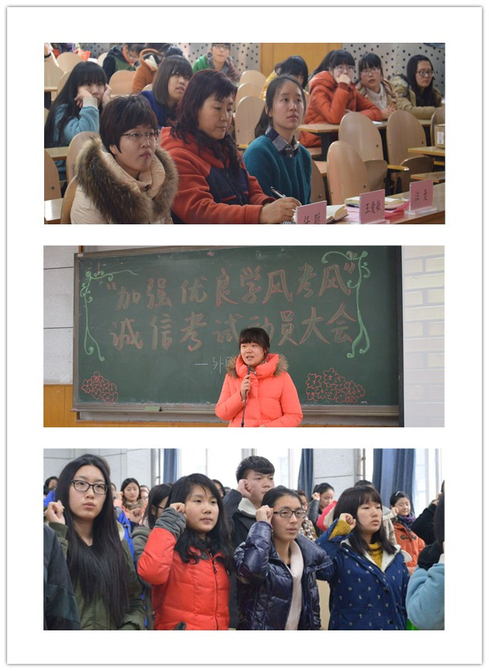 学生代表英语1402班李梦楠同学表示,诚信是社会主义核心价值观对公民的要求,号召全体同学认真备考,传承传统美德,坚持自尊自爱,交出一份诚信答卷。最后,全体学生庄重宣誓,承诺“将自觉遵守考试纪律,公平参与考试竞争,自警自律,自尊自爱,诚信考试,拒绝作弊,以优异成绩回报家人,回报学校”。