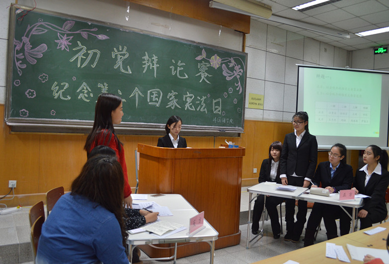 团委在阶梯201举办法制主题辩论赛,全体党校初级班学员组建十支参赛队参加了辩论赛,学院主席团、学生党支部副书记担任评委。