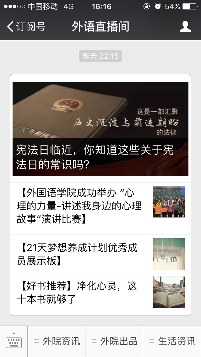 在学院“外语直播间”微信平台开展线上法律主题宣传,普及宪法的制定和修订历史、作用等知识,号召全体学生学法知法用法。