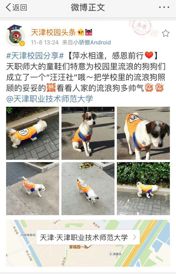 汪汪社为校园里的流浪动物穿上了衣服,同时还开展了丰富多彩的暖心活动,彰显出新时代大学生与自然和谐相处、关爱弱势群体、珍惜生命的人文素养。