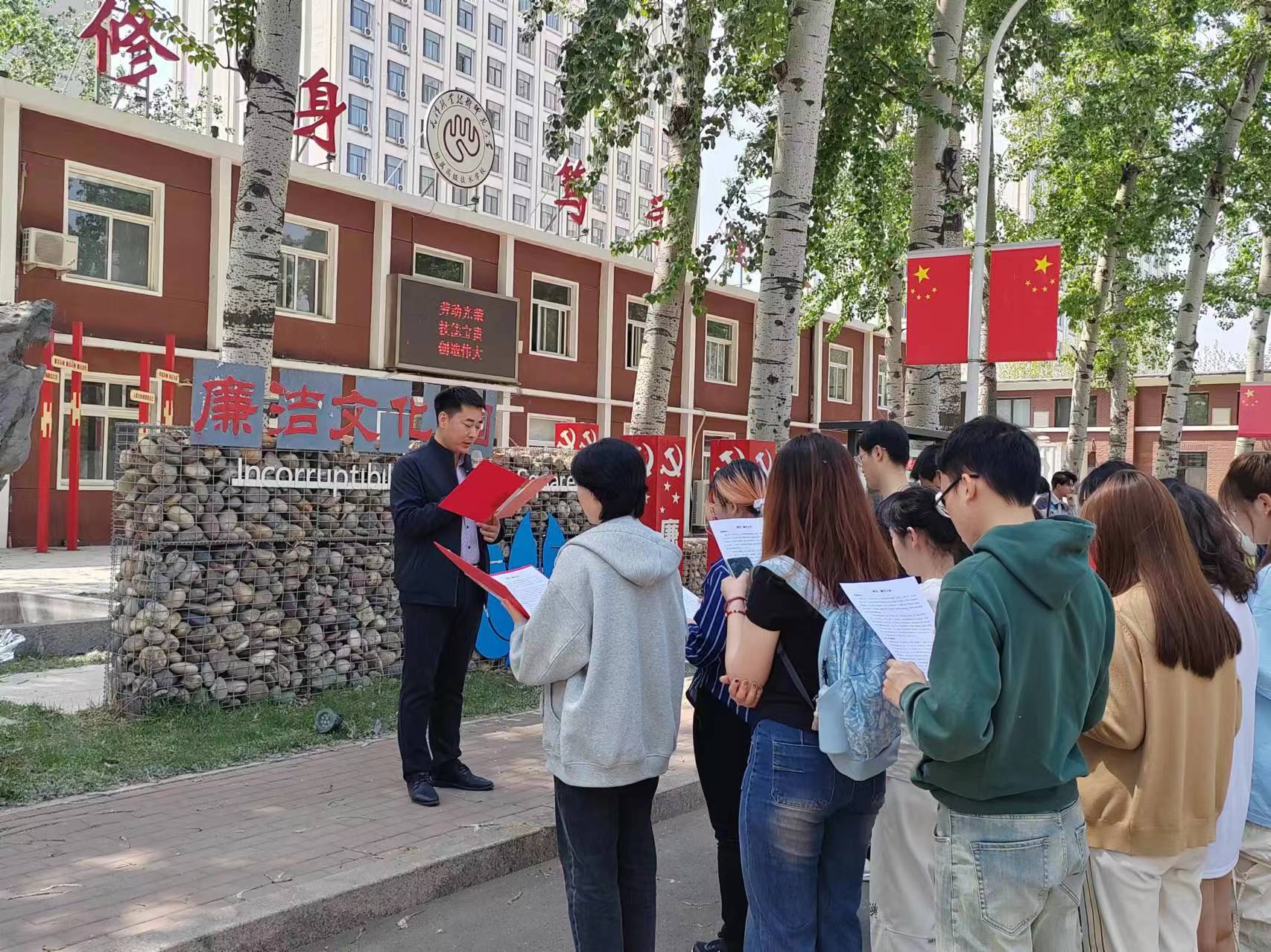 朗诵环节,李刚为同学们分享了《习近平用典》中《廉洁,诚信之本》相关内容并谈体会。他表示,诚信是祖先留给我们的宝贵精神财富。诚实守信,实实在在做人、认认真真做学问是中华民族传统美德。作为新时代大学生,要牢固树立诚信意识,“廉”以律己,“洁”以明德,让“诚信”成为新时代青年的亮丽底色。日语2202班团支部李欣悦、汉教2201班团支部兰天、汉教2301班团支部赵雨琳分享了读书心得。最后,全体师生齐读了文章部分内容,朗朗“读理声”回响在廉洁文化园。