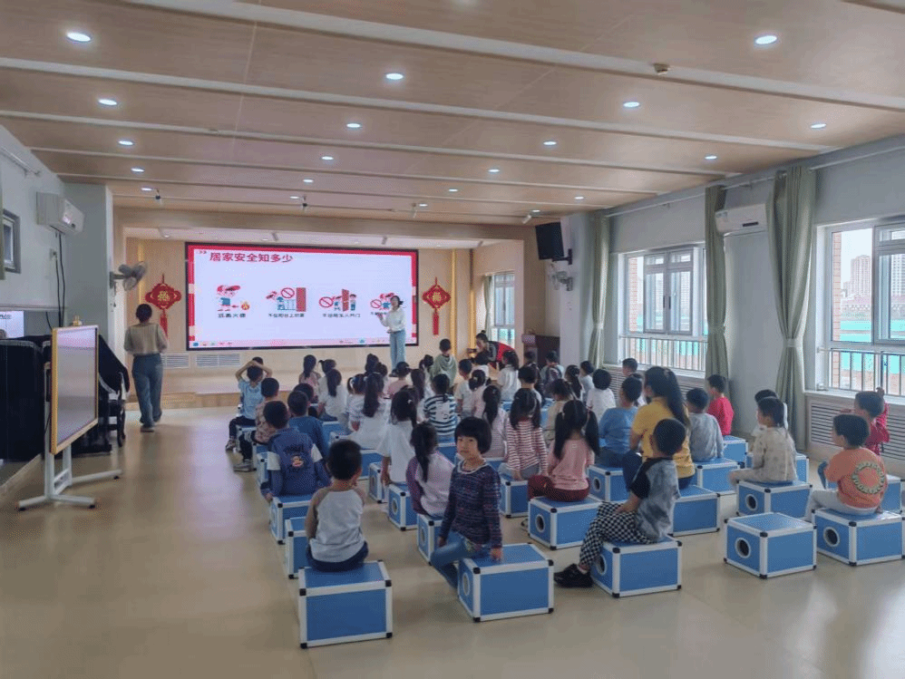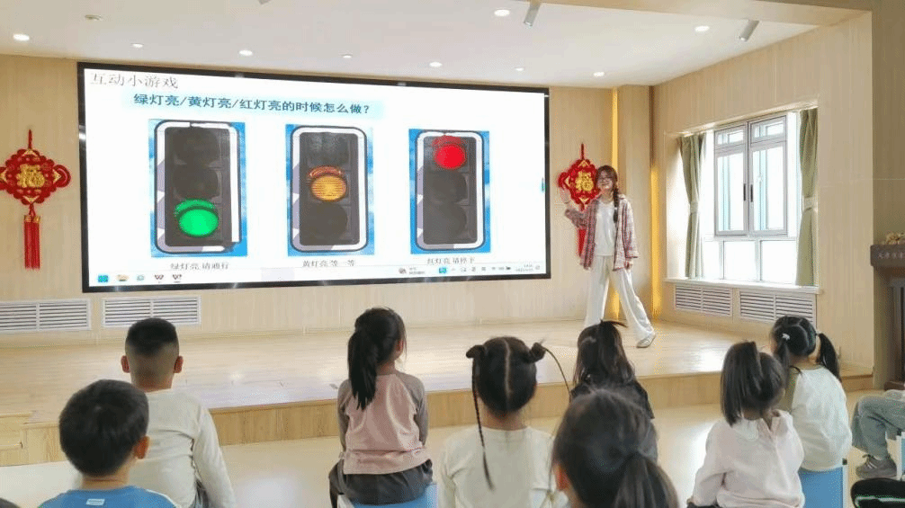 活动围绕“寓教于乐,安全知识润童心”和“温情互动,携手共筑安全防线”两个方面展开。活动伊始,汉教2301班学生周梦彤以活泼的儿歌开场,通过动画短片和情景模拟,向孩子们讲解地震、暴雨等自然灾害的应对方法。汉教2401班学生李琼用彩色交通标志卡片和“红绿灯”游戏,带领小朋友们学习交通安全规则。汉教2401班张璎璐则通过小故事的讲解演绎家庭安全场景,提醒小朋友“不碰插座”“不要给陌生人开门”等等,台下的小观众们积极参与,时而紧张捂嘴,时而欢呼鼓掌。